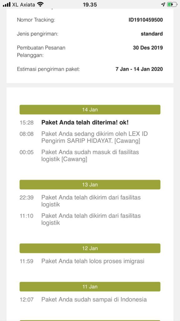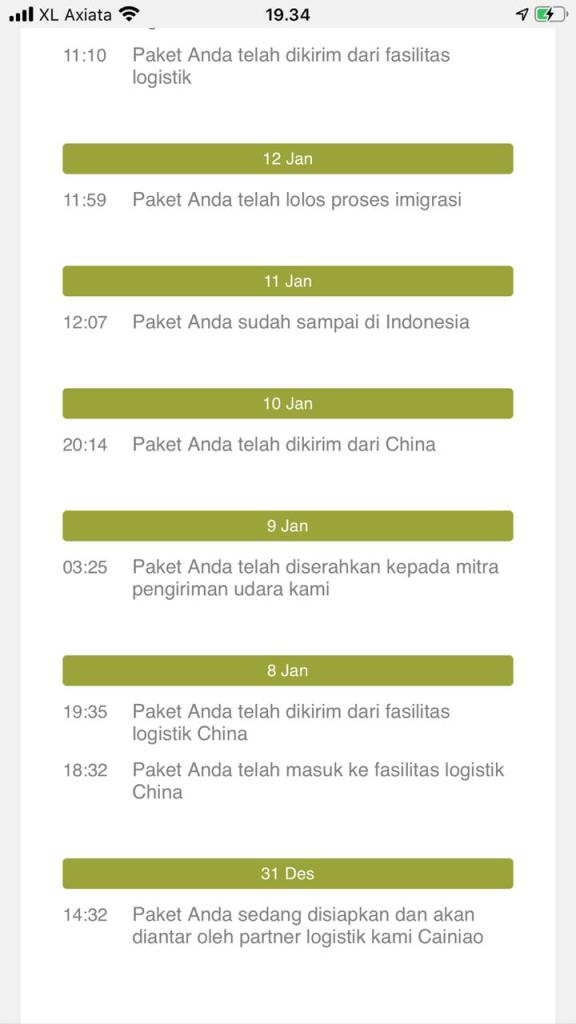 Ternyata, butuh waktu 7 hari sejak konfirmasi pembayaran sampai barang diambil oleh kurir logistik. Kemudian, butuh 1 hari untuk sampai ke pusat logistik Cina. Selanjutnya, butuh 1 hari lagi untuk diserahkan ke bagian pengiriman udara. Dan butuh 2 hari untuk sampai di Indonesia.